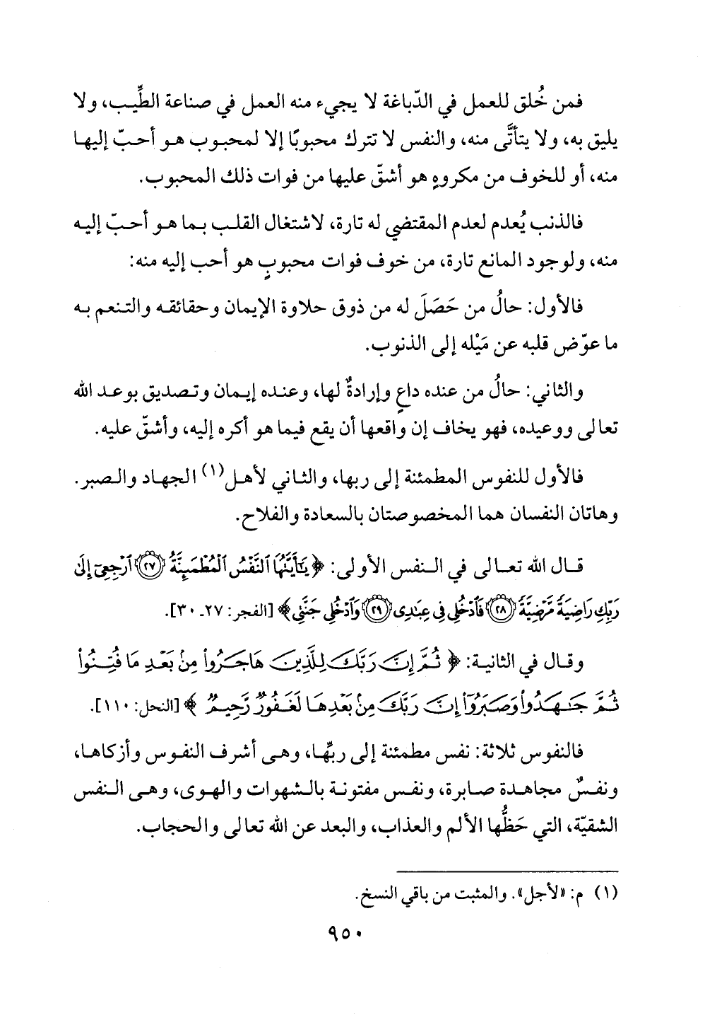 فالأول للنفوس المطمئنة إلى ربها، والثاني لأهل (¬1) الجهاد والصبر. وهاتان النفسان هما المخصوصتان بالسعادة والفلاح.