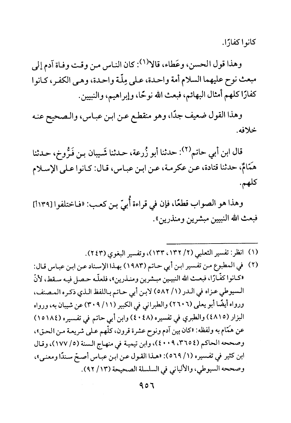 (¬2) في المطبوع من تفسير ابن أبي حاتم (1983) بهذا الإسناد عن ابن عباس قال: "كانوا كفارًا، فبعث الله النبيين مبشرين ومنذرين"، فلعله حصل فيه سقط، لأن السيوطي عزاه في الدر (1/ 582) لابن أبي حاتم باللفظ الذي ذكره المصنف، ورواه أيضًا أبو يعلى (2606) والطبراني في الكبير (11/ 309) عن شيبان به، ورواه البزار (4815) والطبري في تفسيره (4048) وابن أبي حاتم في تفسيره (15184) عن هَمّام به ولفظه: "كان بين آدم ونوح عشرة قرون، كلّهم على شريعة من الحق"، وصححه الحاكم (3654، 4009)، وابن تيمية في منهاج السنة (5/ 177)، وقال ابن كثير في تفسيره (1/ 569): "هذا القول عن ابن عباس أصحّ سندًا ومعنى"، وصححه السيوطي، والألباني في السلسلة الصحيحة (13/ 92).