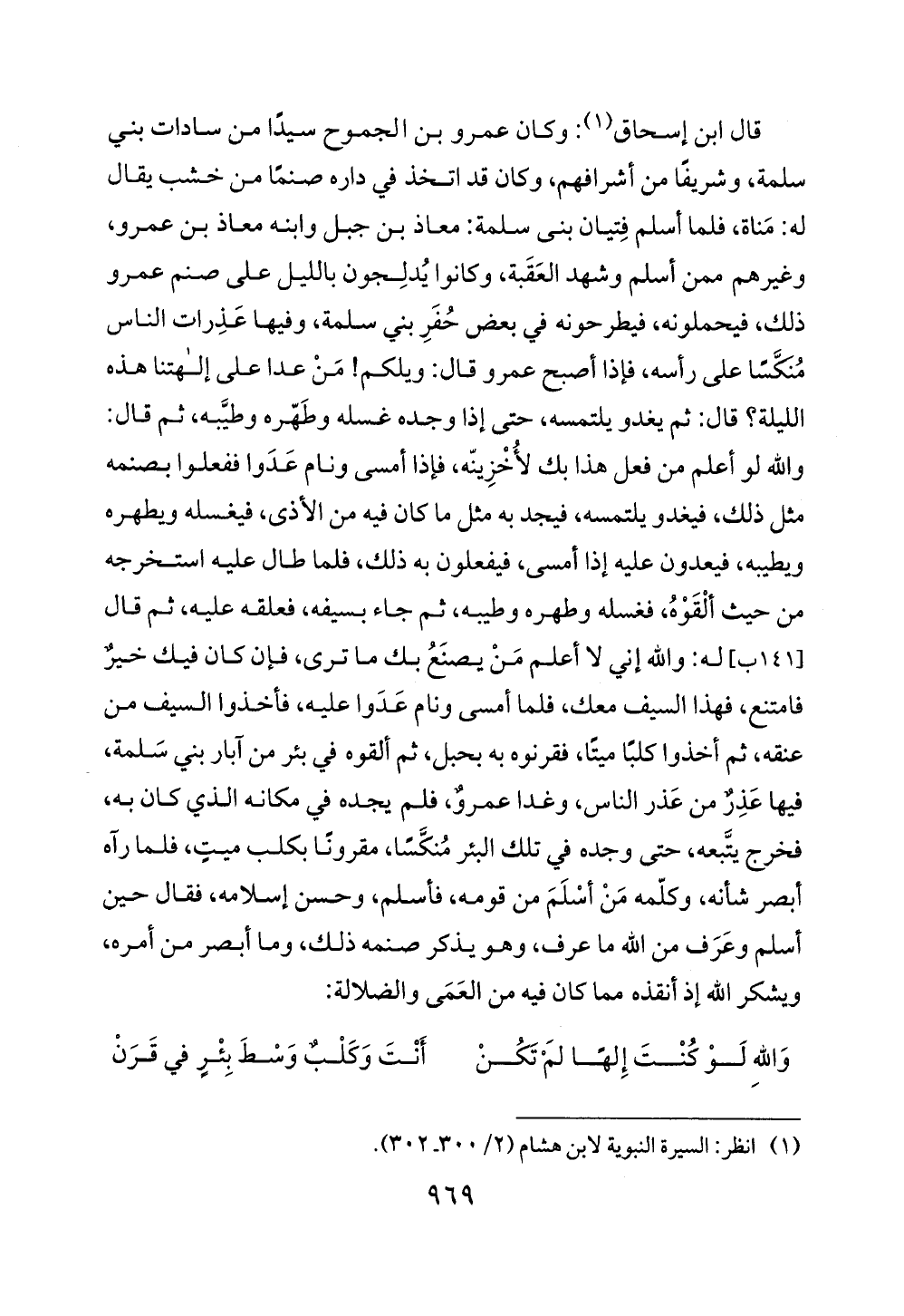 قال ابن إسحاق (¬1): وكان عمرو بن الجموح سيدًا من سادات بني سلمة، وشريفًا من أشرافهم، وكان قد اتخذ في داره صنمًا من خشب يقال له: مَناة، فلما أسلم فِتيان بنى سلمة: معاذ بن جبل وابنه معاذ بن عمرو، وغيرهم ممن أسلم وشهد العَقَبة، وكانوا يُدلِجون بالليل على صنم عمرو ذلك، فيحملونه، فيطرحونه في بعض حُفَرِ بني سلمة، وفيها عَذِرات الناس مُنكسًا على رأسه، فإذا أصبح عمرو قال: ويلكم! مَنْ عدا على إلهتنا هذه الليلة؟ قال: ثم يغدو يلتمسه، حتى إذا وجده غسله وطَهّره وطيَّبه، ثم قال: والله لو أعلم من فعل هذا بك لأُخْزِينّه، فإذا أمسى ونام عَدَوا ففعلوا بصنمه مثل ذلك، فيغدو يلتمسه، فيجد به مثل ما كان فيه من الأذى، فيغسله ويطهره ويطيبه، فيعدون عليه إذا أمسى، فيفعلون به ذلك، فلما طال عليه استخرجه من حيث ألْقَوْهُ، فغسله وطهره وطيبه، ثم جاء بسيفه، فعلقه عليه، ثم قال له: والله إني لا أعلم مَنْ يصنَعُ بك ما ترى، فإن كان فيك خيرٌ فامتنع، فهذا السيف معك، فلما أمسى ونام عَدَوا عليه، فأخذوا السيف من عنقه، ثم أخذوا كلبًا ميتًا، فقرنوه به بحبل، ثم ألقوه في بئر من آبار بني سَلمة، فيها عَذِرٌ من عَذر الناس، وغدا عمروٌ، فلم يجده في مكانه الذي كان به، فخرج يتَّبعه، حتى وجده في تلك البئر مُنكَسًا، مقرونًا بكلب ميتٍ، فلما رآه أبصر شأنه، وكلّمه مَنْ أسْلَمَ من قومه، فأسلم، وحسن إسلامه، فقال حين أسلم وعَرَف من الله ما عرف، وهو يذكر صنمه ذلك، وما أبصر من أمره، ويشكر الله إذ أنقذه مما كان فيه من العَمَى والضلالة: