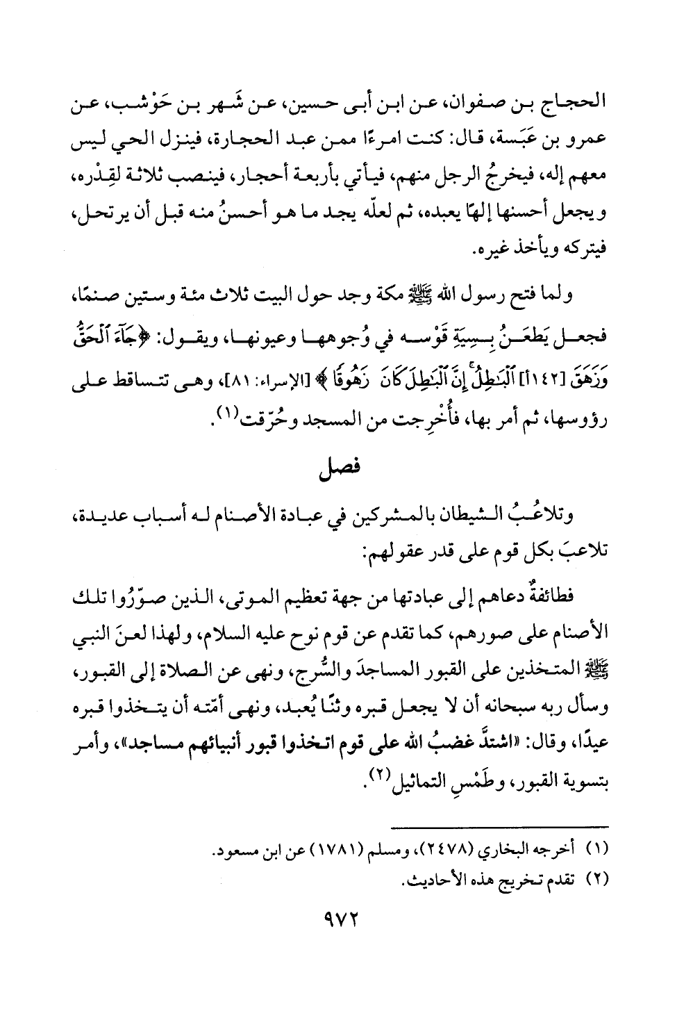 الحجاج بن صفوان، عن ابن أبى حسين، عن شَهر بن حَوْشب، عن عمرو بن عَبَسة، قال: كنت امرءًا ممن عبد الحجارة، فينزل الحي ليس معهم إله، فيخرجُ الرجل منهم، فيأتي بأربعة أحجار، فينصب ثلاثة لقِدْره، ويجعل أحسنها إلهَا يعبده، ثم لعلّه يجد ما هو أحسنُ منه قبل أن يرتحل، فيتركه ويأخذ غيره.