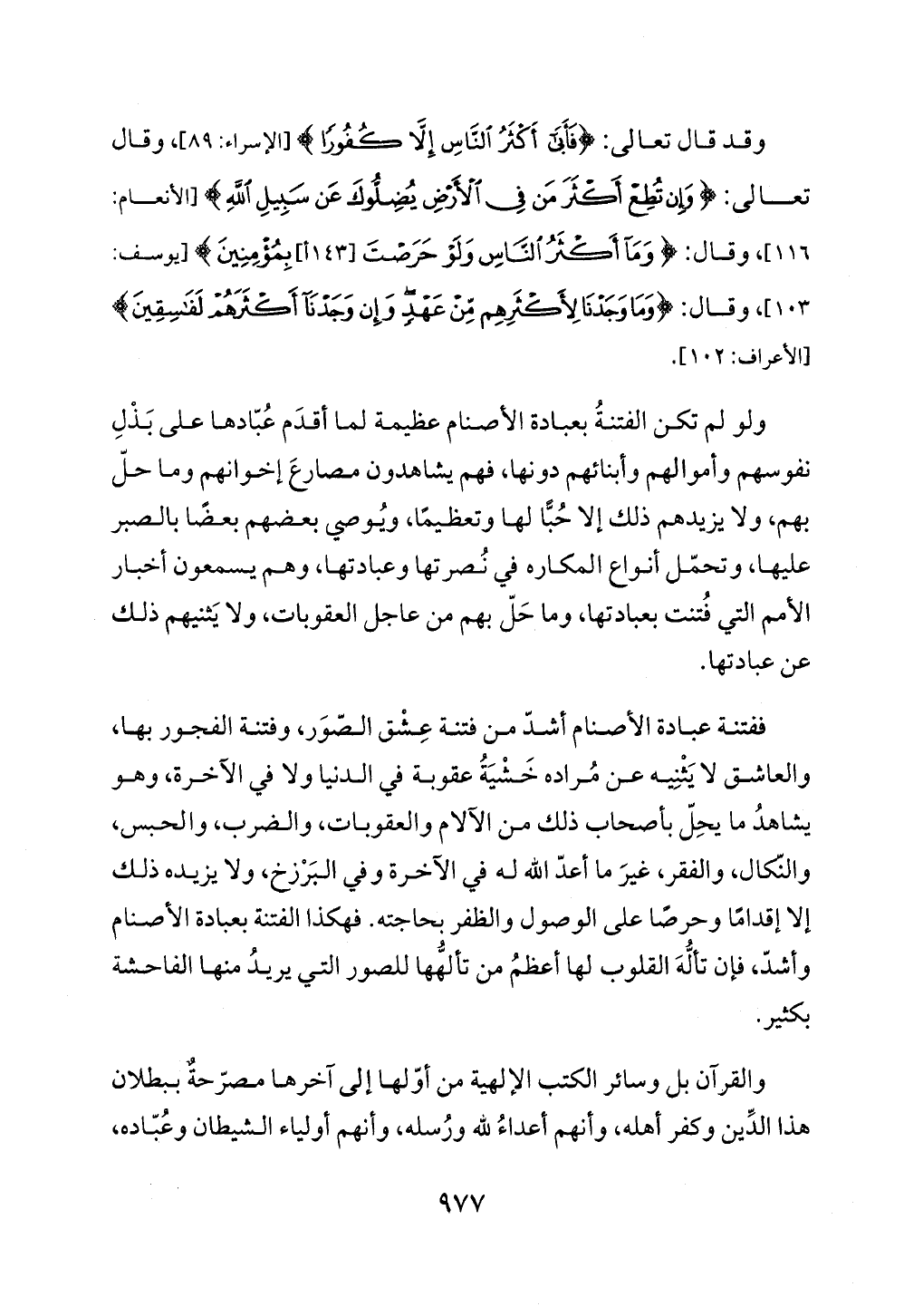 ففتنة عبادة الأصنام أشدّ من فتنة عِشْق الصّوَر، وفتنة الفجور بها، والعاشق لا يَثْنِيه عن مُراده خَشْيَةُ عقوبة في الدنيا ولا في الآخرة، وهو يشاهدُ ما يحِلّ بأصحاب ذلك من الآلام والعقوبات، والضرب، والحبس، والنكال، والفقر، غيرَ ما أعدّ الله له في الآخرة وفي البَرْزخ، ولا يزيده ذلك إلا إقدامًا وحرصًا على الوصول والظفر بحاجته. فهكذا الفتنة بعبادة الأصنام وأشدّ، فإن تالُّهَ القلوب لها أعظمُ من تألهُّها للصور التي يريدُ منها الفاحشة بكثير.