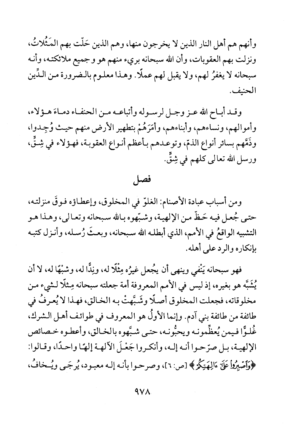 فهو سبحانه يَنْفي وينهى أن يجُعل غيرُه مِثْلًا له، ويدًّا له، وشبْهًا له، لا أن يُشَبَّه هو بغيره، إذ ليس في الأمم المعروفة أمة جعلته سبحانه مِثلاً لشيء من مخلوقاته، فجعلت المخلوق أصلًا وشَبَّهتْ به الخالق، فهذا لا يُعرفُ في طائفة من طائفة بني آدم. وإنما الأولُ هو المعروف في طوائف أهل الشرك، غُلوًّا فيمن يُعظِّمونه ويحبُّونه، حتى شبَّهوه بالخالق، وأعطوه خصائص الإلهية، بل صرّحوا أنه إله، وأنكروا جَعْلَ الآلهة إلهًا واحدًا، وقالوا: {وَاصْبِرُوا عَلَى آلِهَتِكُمْ} [ص: 6]، وصرحوا بأنه إله معبود، يُرجَى ويُخافُ،