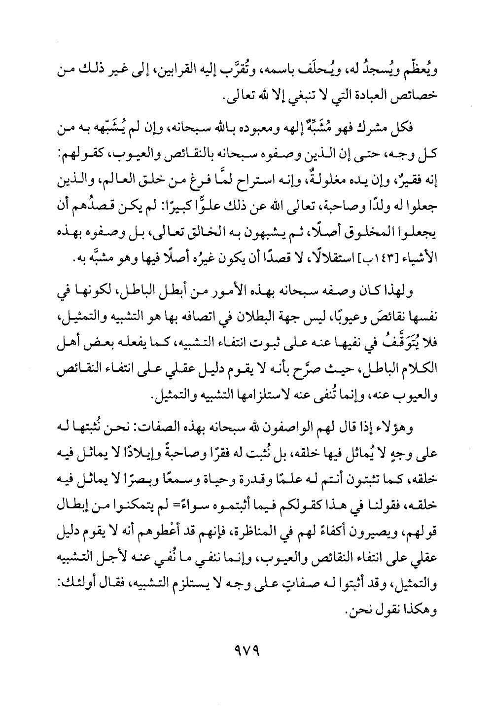 ولهذا كان وصفه سبحانه بهذه الأمور من أبطل الباطل، لكونها في نفسها نقائصَ وعيوبًا، ليس جهة البطلان في اتصافه بها هو التشبيه والتمثيل، فلا يُتَوَقَّفُ في نفيها عنه على ثبوت انتفاء التشبيه، كما يفعله بعض أهل الكلام الباطل، حيث صرَّح بأنه لا يقوم دليل عقلي على انتفاء النقائص والعيوب عنه، وإنما تُنفى عنه لاستلزامها التشبيه والتمثيل.