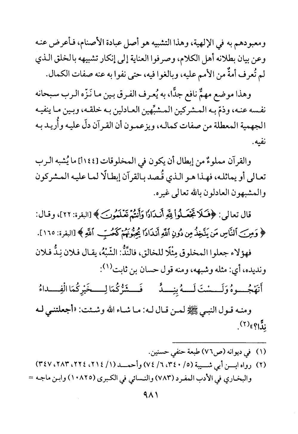 فهؤلاء جعلوا المخلوق مِثْلًا للخالق، فالنِّدُّ: الشّبْهُ، يقال فلان نِدُّ فلان ونديده، أي: مثله وشبهه، ومنه قول حسان بن ثابت (¬1):