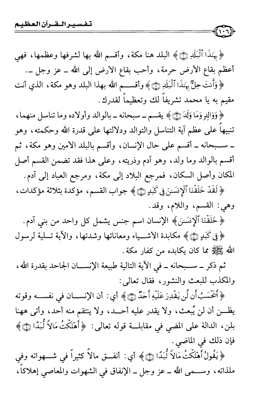 {بِهَذَا الْبَلَدِ} البلد هنا مكة، وأقسم الله بها لشرفها وعظمها، فهي أعظم بقاع الأرض حرمة، وأحب بقاع الأرض إلى الله عز وجل.