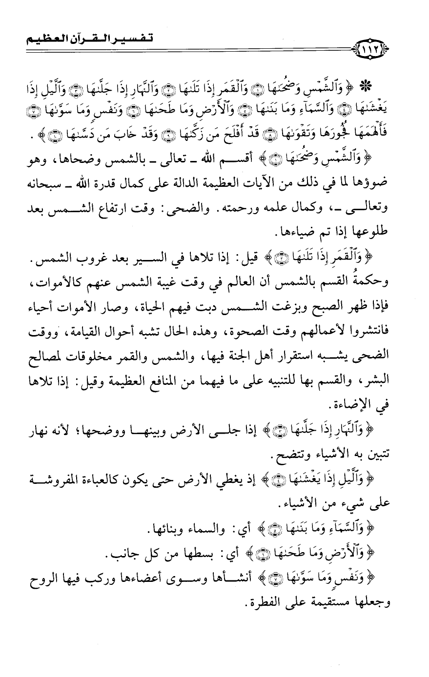 {وَالشَّمْسِ وَضُحَاهَا * وَالْقَمَرِ إِذَا تَلَاهَا * وَالنَّهَارِ إِذَا جَلَّاهَا * وَاللَّيْلِ إِذَا يَغْشَاهَا * وَالسَّمَاءِ وَمَا بَنَاهَا * وَالْأَرْضِ وَمَا طَحَاهَا * وَنَفْسٍ وَمَا سَوَّاهَا * فَأَلْهَمَهَا فُجُورَهَا وَتَقْوَاهَا * قَدْ أَفْلَحَ مَنْ زَكَّاهَا * وَقَدْ خَابَ مَنْ دَسَّاهَا}.