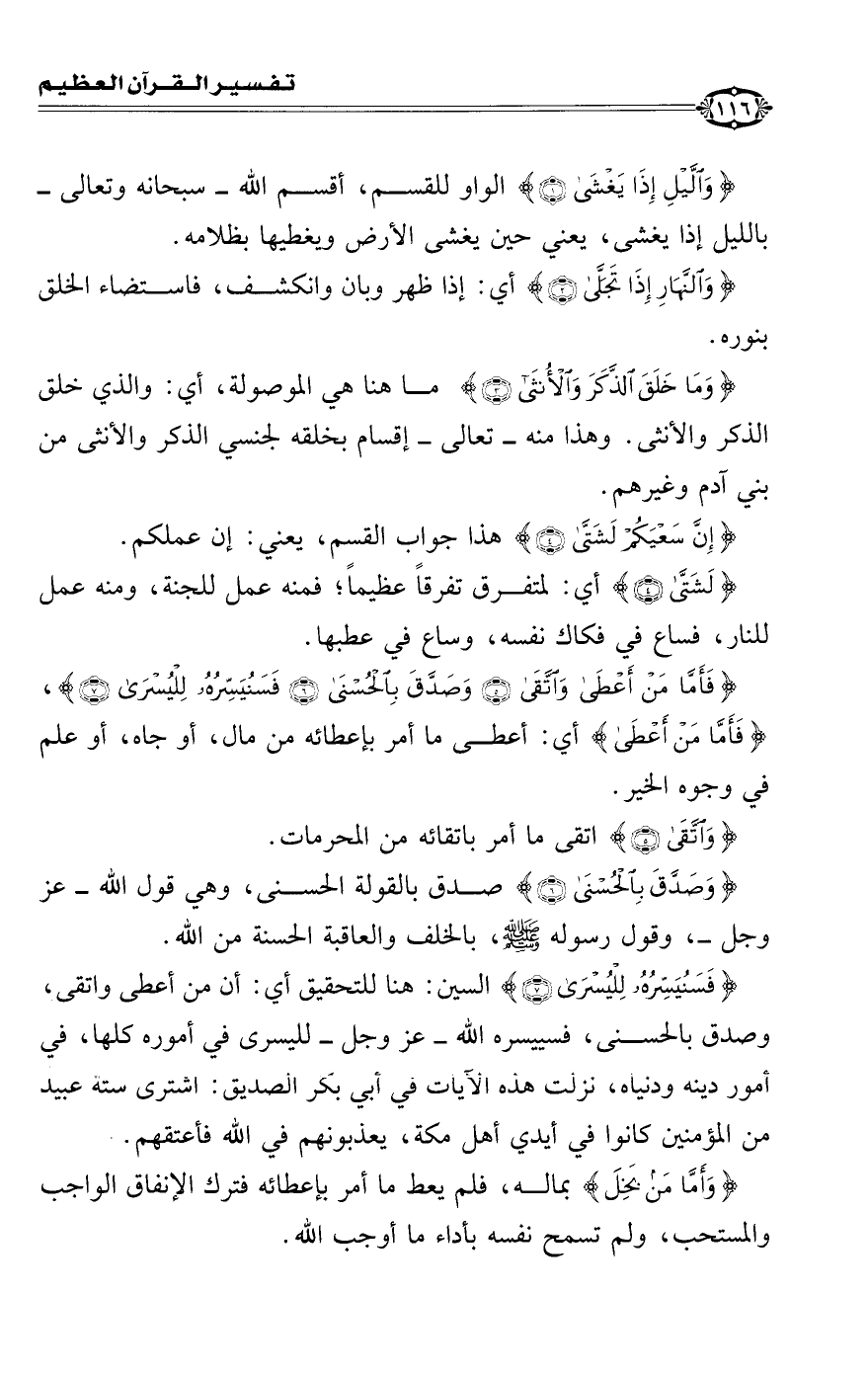 {فَسَنُيَسِّرُهُ لِلْيُسْرَى} السين: هنا للتحقيق, أي: أن من أعطى واتقى وصدق بالحسنى فسيسره الله عز وجل لليسرى في أموره كلها، في أمور دينه ودنياه، نزلت هذه الآيات في أبي بكر الصديق: اشترى ستة عبيد من المؤمنين كانوا في أيدي أهل مكة، يعذبونهم في الله فأعتقهم.