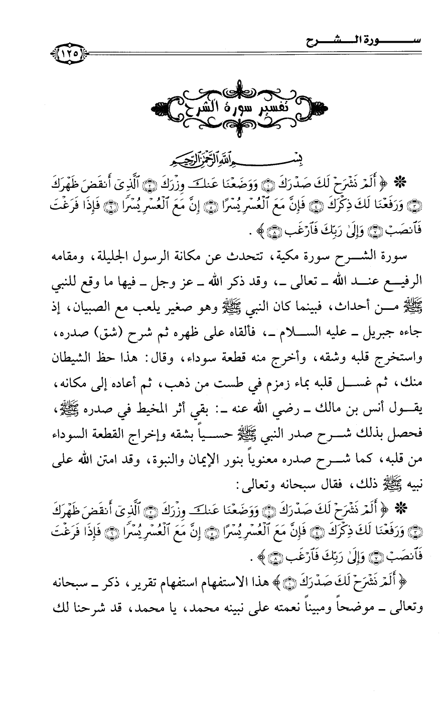 {أَلَمْ نَشْرَحْ لَكَ صَدْرَكَ * وَوَضَعْنَا عَنْكَ وِزْرَكَ * الَّذِي أَنْقَضَ ظَهْرَكَ * وَرَفَعْنَا لَكَ ذِكْرَكَ * فَإِنَّ مَعَ الْعُسْرِ يُسْرًا * إِنَّ مَعَ الْعُسْرِ يُسْرًا * فَإِذَا فَرَغْتَ فَانْصَبْ * وَإِلَى رَبِّكَ فَارْغَبْ}.