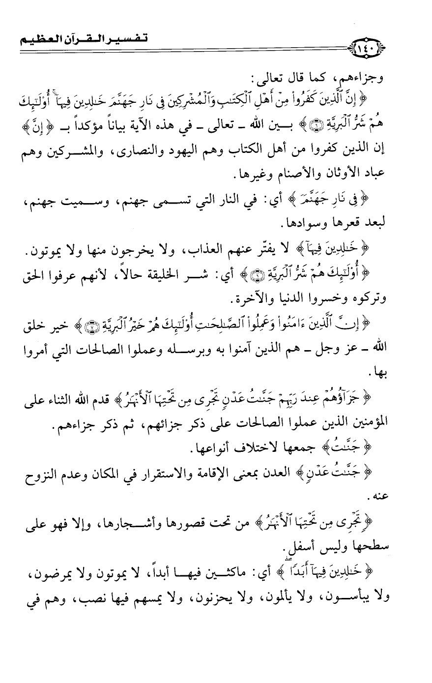 {إِنَّ الَّذِينَ كَفَرُوا مِنْ أَهْلِ الْكِتَابِ وَالْمُشْرِكِينَ فِي نَارِ جَهَنَّمَ خَالِدِينَ فِيهَا أُولَئِكَ هُمْ شَرُّ الْبَرِيَّةِ} بين الله تعالى في هذه الآية بيانًا مؤكدًا بـ (إن) إن الذين كفروا من أهل الكتاب وهم اليهود والنصارى، والمشركين وهم عباد الأوثان والأصنام وغيرها.