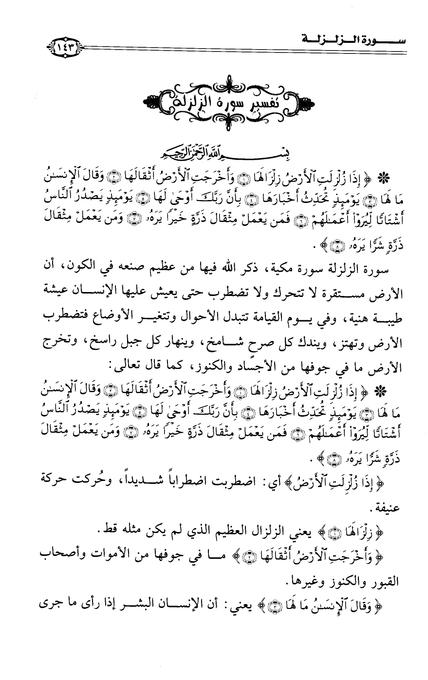 {إِذَا زُلْزِلَتِ الْأَرْضُ زِلْزَالَهَا * وَأَخْرَجَتِ الْأَرْضُ أَثْقَالَهَا * وَقَالَ الْإِنْسَانُ مَا لَهَا * يَوْمَئِذٍ تُحَدِّثُ أَخْبَارَهَا * بِأَنَّ رَبَّكَ أَوْحَى لَهَا * يَوْمَئِذٍ يَصْدُرُ النَّاسُ أَشْتَاتًا لِيُرَوْا أَعْمَالَهُمْ * فَمَنْ يَعْمَلْ مِثْقَالَ ذَرَّةٍ خَيْرًا يَرَهُ * وَمَنْ يَعْمَلْ مِثْقَالَ ذَرَّةٍ شَرًّا يَرَهُ}.