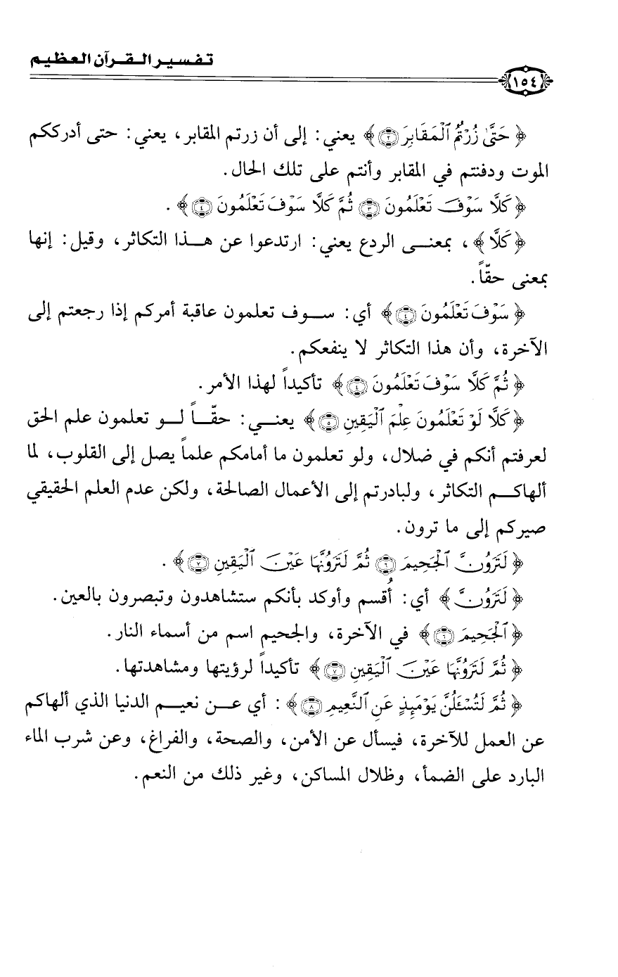 {كَلَّا لَوْ تَعْلَمُونَ عِلْمَ الْيَقِينِ} يعني: حقًا لو تعلمون علم الحق لعرفتم أنكم في ضلال، ولو تعلمون ما أمامكم علمًا يصل إلى القلوب، لما ألهاكم التكاثر، ولبادرتم إلى الأعمال الصالحة، ولكن عدم العلم الحقيقي صيركم إلى ما ترون.