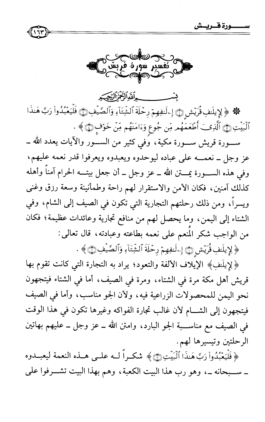 {لِإِيلَافِ قُرَيْشٍ * إِيلَافِهِمْ رِحْلَةَ الشِّتَاءِ وَالصَّيْفِ * فَلْيَعْبُدُوا رَبَّ هَذَا الْبَيْتِ * الَّذِي أَطْعَمَهُمْ مِنْ جُوعٍ وَآمَنَهُمْ مِنْ خَوْفٍ}.