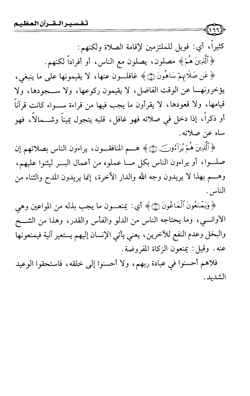 {عَنْ صَلَاتِهِمْ سَاهُونَ} غافلون عنها، لا يقيمونها على ما ينبغي يؤخرونها عن الوقت الفاضل، لا يقيمون ركوعها، ولا سجودها، ولا قيامها ولا قعودها، لا يقرؤون ما يجب فيها من قراءة سورة كانت قرآنًا أو ذكرًا إذا دخل في صلاته فهو غافل، قلبه يتجول يمينًا وشمالاً فهو ساهٍ عن صلاته.