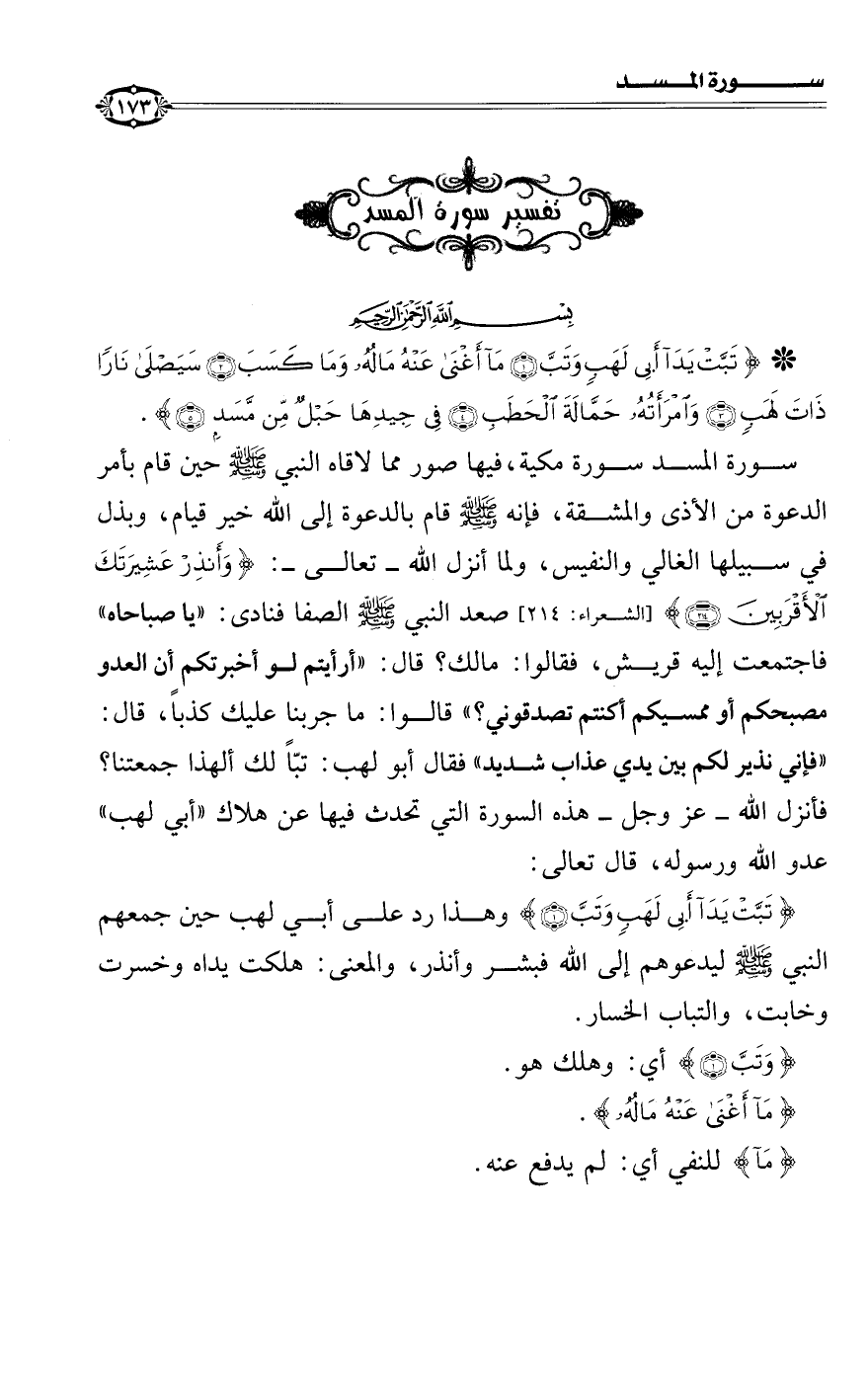 {تَبَّتْ يَدَا أَبِي لَهَبٍ وَتَبَّ * مَا أَغْنَى عَنْهُ مَالُهُ وَمَا كَسَبَ * سَيَصْلَى نَارًا ذَاتَ لَهَبٍ * وَامْرَأَتُهُ حَمَّالَةَ الْحَطَبِ * فِي جِيدِهَا حَبْلٌ مِنْ مَسَدٍ}.