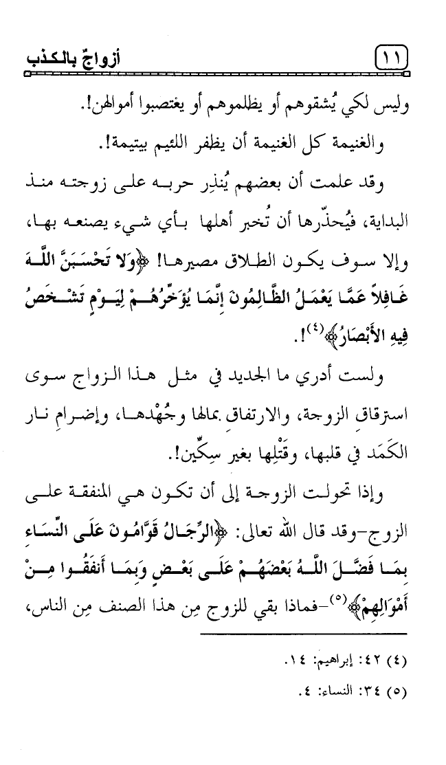 ولست أدري ما الجديد في مثل هذا الزواج سوى استرقاقِ الزوجة، والارتفاقِ بمالها وجُهْدها، وإضرامِ نار الكَمَد في قلبها، وقَتْلِها بغير سِكِّين!.