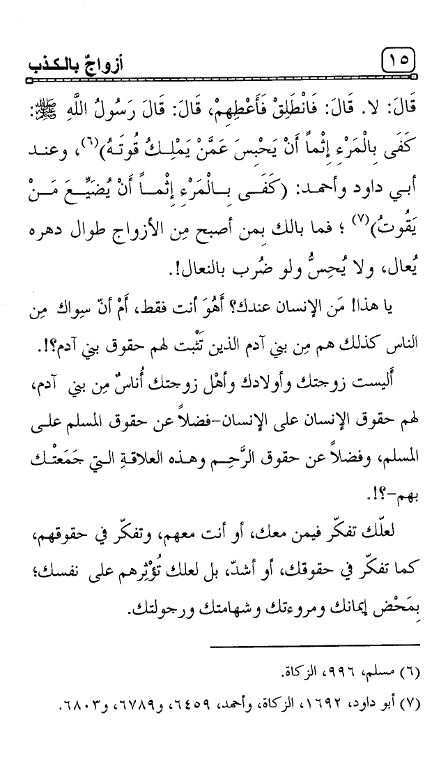 قَالَ: لا. قَالَ: فَانْطَلِقْ فَأَعْطِهِمْ، قَالَ: قال رَسُولُ اللَّهِ صلى الله عليه وسلم: "كَفَى بِالْمَرْءِ إِثْماً أَنْ يَحْبِسَ عَمَّنْ يَمْلِكُ قُوتَهُ" 1، وعند أبي داود وأحمد: "كَفَى بِالْمَرْءِ إِثْماً أَنْ يُضَيِّعَ مَنْ يَقُوتُ" 2؛ فما بالك بِمن أصبح مِن الأزواج طوال دهره يُعال، ولا يُحِسُّ ولو ضُرب بالنعال!.