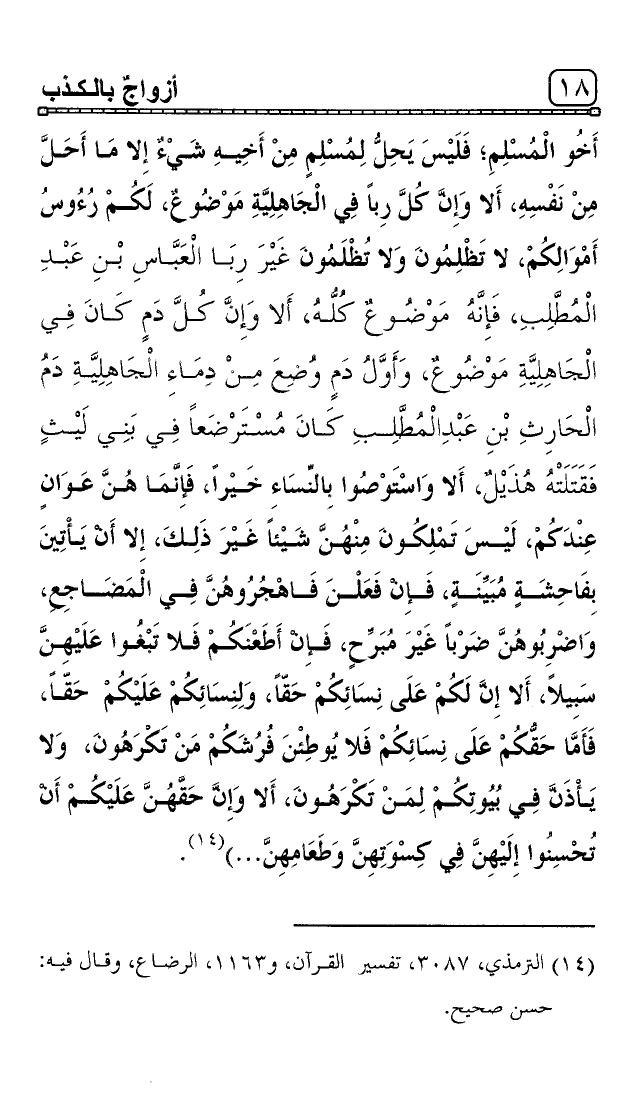 أَخُو الْمُسْلِمِ؛ فَلَيْسَ يَحِلُّ لِمُسْلِمٍ مِنْ أَخِيهِ شَيْءٌ إِلا مَا أَحَلَّ مِنْ نَفْسِهِ، أَلا وَإِنَّ كُلَّ رِباً فِي الْجَاهِلِيَّةِ مَوْضُوعٌ، لَكُمْ رُءُوسُ أَمْوَالِكُمْ، لا تَظْلِمُونَ وَلا تُظْلَمُونَ غَيْرَ رِبَا الْعَبَّاسِ بْنِ عَبْدِ الْمُطَّلِبِ، فَإِنَّهُ مَوْضُوعٌ كُلُّهُ، أَلا وَإِنَّ كُلَّ دَمٍ كَانَ فِي الْجَاهِلِيَّةِ مَوْضُوعٌ، وَأَوَّلُ دَمٍ وُضِعَ مِنْ دِمَاءِ الْجَاهِلِيَّةِ دَمُ الْحَارِثِ بْنِ عَبْدِالْمُطَّلِبِ كَانَ مُسْتَرْضَعاً فِي بَنِي لَيْثٍ فَقَتَلَتْهُ هُذَيْلٌ، أَلا وَاسْتَوْصُوا بِالنِّسَاءِ خَيْراً، فَإِنَّمَا هُنَّ عَوَانٍ عِنْدَكُمْ، لَيْسَ تَمْلِكُونَ مِنْهُنَّ شَيْئاً غَيْرَ ذَلِكَ، إِلا أَنْ يَأْتِينَ بِفَاحِشَةٍ مُبَيِّنَةٍ، فَإِنْ فَعَلْنَ فَاهْجُرُوهُنَّ فِي الْمَضَاجِعِ، وَاضْرِبُوهُنَّ ضَرْباً غَيْرَ مُبَرِّحٍ، فَإِنْ أَطَعْنَكُمْ فَلا تَبْغُوا عَلَيْهِنَّ سَبِيلاً، أَلا إِنَّ لَكُمْ عَلَى نِسَائِكُمْ حَقّاً، وَلِنِسَائِكُمْ عَلَيْكُمْ حَقّاً، فَأَمَّا حَقُّكُمْ عَلَى نِسَائِكُمْ فَلا يُوطِئْنَ فُرُشَكُمْ مَنْ تَكْرَهُونَ، وَلا يَأْذَنَّ فِي بُيُوتِكُمْ لِمَنْ تَكْرَهُونَ، أَلا وَإِنَّ حَقَّهُنَّ عَلَيْكُمْ أَنْ تُحْسِنُوا إِلَيْهِنَّ فِي كِسْوَتِهِنَّ وَطَعَامِهِنَّ ... " 1.