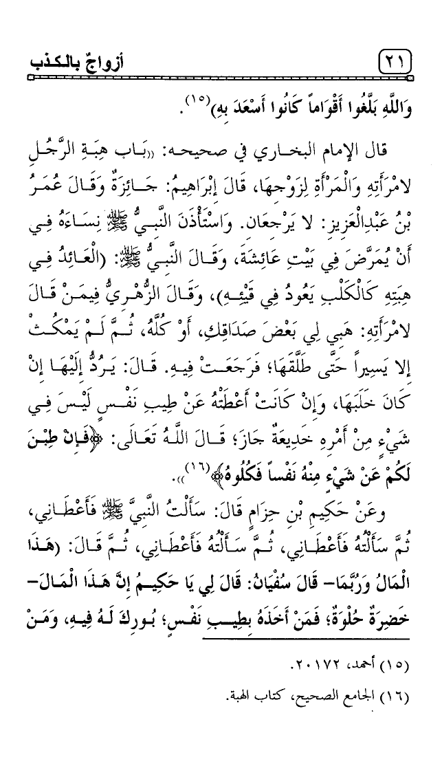 وقال الإمام البخاري في صحيحه: بَاب هِبَةِ الرَّجُلِ لامْرَأَتِهِ وَالْمَرْأَةِ لِزَوْجِهَا، قَالَ إِبْرَاهِيمُ: جَائِزَةٌ وَقَالَ عُمَرُ بْنُ عَبْدِالْعَزِيزِ: لا يَرْجِعَانِ. وَاسْتَأْذَنَ النَّبِيُّ صلى الله عليه وسلم نِسَاءَهُ فِي أَنْ يُمَرَّضَ فِي بَيْتِ عَائِشَةَ، وَقَالَ النَّبِيُّ صلى الله عليه وسلم: "الْعَائِدُ فِي هِبَتِهِ كَالْكَلْبِ يَعُودُ فِي قَيْئِهِ"، وَقَالَ الزُّهْرِيُّ فِيمَنْ قَالَ لامْرَأَتِهِ: هَبِي لِي بَعْضَ صَدَاقِكِ، أَوْ كُلَّهُ، ثُمَّ لَمْ يَمْكُثْ إِلا يَسِيراً حَتَّى طَلَّقَهَا؛ فَرَجَعَتْ فِيهِ. قَالَ: يَرُدُّ إِلَيْهَا إِنْ كَانَ خَلَبَهَاأي: خَدَعَها، وَإِنْ كَانَتْ أَعْطَتْهُ عَنْ طِيبِ نَفْسٍ لَيْسَ فِي شَيْءٍ مِنْ أَمْرِهِ خَدِيعَةٌ جَازَ؛ قَالَ اللَّهُ تَعَالَى: {فَإِنْ طِبْنَ لَكُمْ عَنْ شَيْءٍ مِنْهُ نَفْساً فَكُلُوهُ} 2.