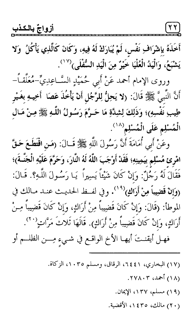 وعَنْ أَبِي أُمَامَةَ أَنَّ رَسُولَ اللَّهِ صلى الله عليه وسلم قَالَ: "مَنِ اقْتَطَعَ حَقَّ امْرِئٍ مُسْلِمٍ بِيَمِينِهِ؛ فَقَدْ أَوْجَبَ اللَّهُ لَهُ النَّارَ، وَحَرَّمَ عَلَيْهِ الْجَنَّةَ"؛ فَقَالَ لَهُ رَجُلٌ: وَإِنْ كَانَ شَيْئاً يَسِيراً يَا رَسُولَ اللَّهِ؟. قَالَ: " وَإِنْ قَضِيباً مِنْ أَرَاكٍ3". وفي لفظ الحديث عند مالك في الموطأ: قَالَ: وَإِنْ كَانَ قَضِيباً مِنْ أَرَاكٍ، "وَإِنْ كَانَ قَضِيباً مِنْ أَرَاكٍ، وَإِنْ كَانَ قَضِيباً مِنْ أَرَاكٍ". قَالَهَا ثَلاثَ مَرَّاتٍ4.