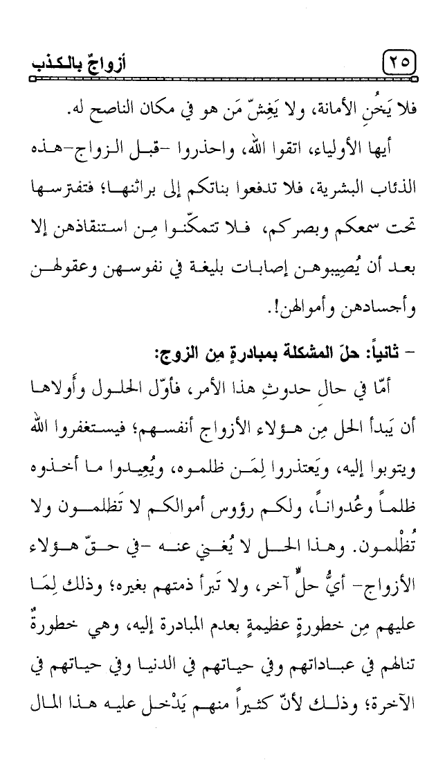 أيها الأولياء، اتقوا الله، واحذروا -قبل الزواج-هذه الذئاب البشرية، فلا تدفعوا بناتكم إلى براثنها؛ فتفترسها تحت سمعكم وبصركم، فلا تتمكّنوا مِن استنقاذهن إلا بعد أن يُصِيبوهن إصابات بليغة في نفوسهن وعقولهن وأجسادهن وأموالهن!.