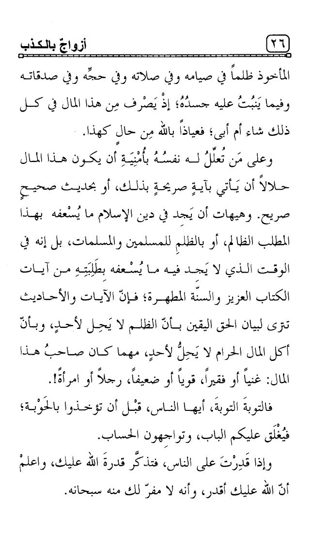 وعلى مَن تُعلِّلُ له نفسُهُ بأُمْنِيَةِ أن يكون هذا المال حلالاً أن يَأتي بآيةٍ صريحةٍ بذلك، أو بحديث صحيحٍ صريح. وهيهات أن يَجِد في دين الإسلام ما يُسْعفه بهذا المطلب الظالم، أو بالظلمِ للمسلمين والمسلمات، بل إنه في الوقت الذي لا يَجِد فيه ما يُسْعفه بِطَلِبَتِهِ من آيات الكتاب العزيز والسنّة المطهرة؛ فإنّ الآيات والأحاديث تترى لبيان الحق اليقين بأنّ الظلم لا يَحِل لأحدٍ، وبأنّ أكل المال الحرام لا يَحِلُّ لأحدٍ، مهما كان صاحبُ هذا المال: غنياً أو فقيراً، قوياً أو ضعيفاً، رجلاً أو امرأةً!.