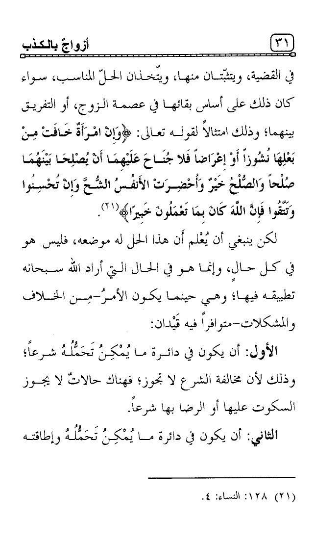 * في القضية، ويتثبّتان منها، ويتّخذان الحلّ المناسب، سواء كان ذلك على أساس بقائها في عصمة الزوج، أو التفريق بينهما؛ وذلك امتثالاً لقوله تعالى: {وَإِنِ امْرَأَةٌ خَافَتْ مِنْ بَعْلِهَا نُشُوزاً أَوْ إِعْرَاضاً فَلا جُنَاحَ عَلَيهِمَا أَنْ يُصْلِحَا بَيْنَهُمَا صُلْحاً وَالصُّلْحُ خَيْرٌ وَأُحْضِرَتِ الْأَنْفُسُ الشُّحَّ وَإِنْ تُحْسِنُوا وَتَتَّقُوا فَإِنَّ اللَّهَ كَانَ بِمَا تَعْمَلُونَ خَبِيراً} 1.