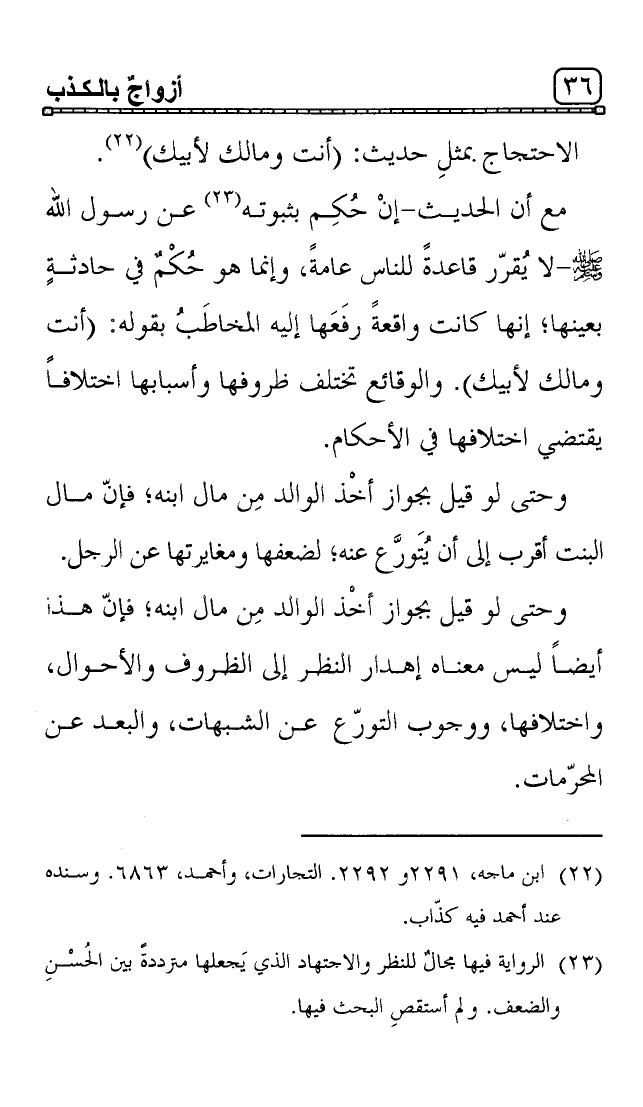 مع أن الحديث-إنْ حُكِم بثبوته2 عن رسول الله صلى الله عليه وسلم-لا يُقرّر قاعدةً للناس عامةً، وإنما هو حُكْمٌ في حادثةٍ بعينها؛ إنها كانت واقعةً رفَعَها إليه المخاطَبُ بقوله: "أنت ومالك لأبيك". والوقائع تختلف ظروفها وأسبابها اختلافاً يقتضي اختلافها في الأحكام.