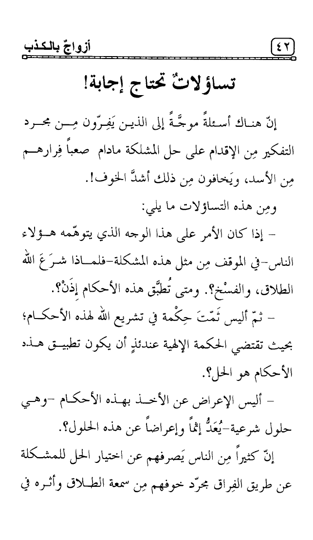 - إذا كان الأمر على هذا الوجه الذي يتوهّمه هؤلاء الناس-في الموقف مِن مثل هذه المشكلة-فلماذا شرَعَ الله الطلاق، والفسْخ؟. ومتى تُطبَّق هذه الأحكام إِذَنْ؟.