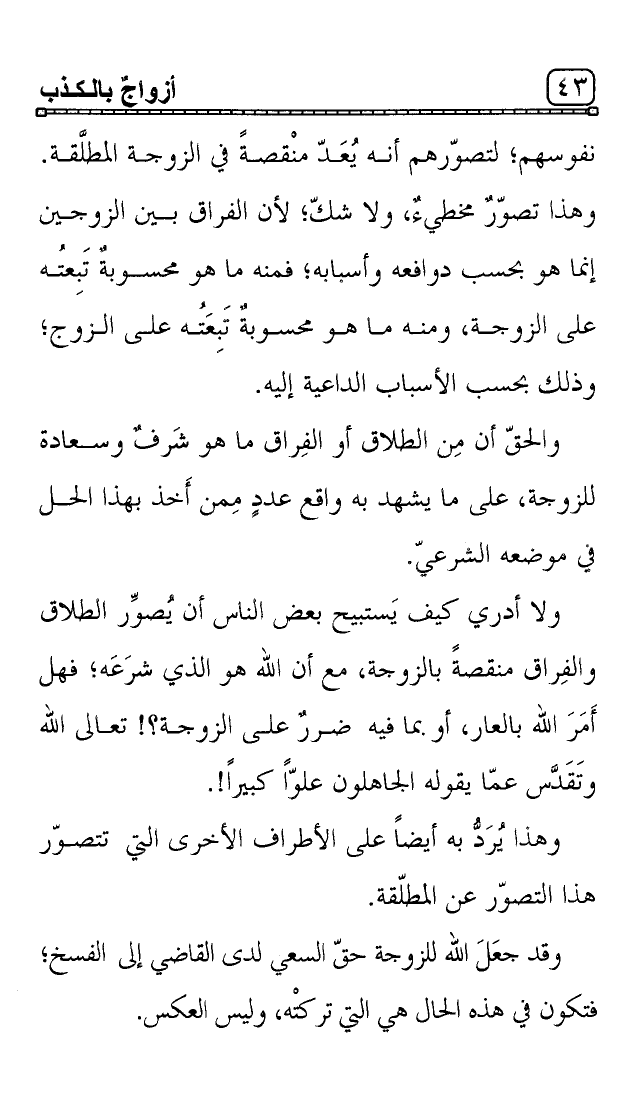 ولا أدري كيف يَستبيح بعض الناس أن يُصوِّر الطلاق والفِراق منقصةً بالزوجة، مع أن الله هو الذي شرَعَه؛ فهل أَمَرَ الله بالعار، أو بما فيه ضررٌ على الزوجة؟! تعالى الله وتَقَدَّس عمّا يقوله الجاهلون علوّاً كبيراً!.