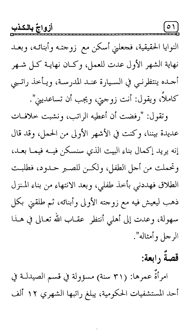 وتقول: "رفضت أن أعطيه الراتب، ونشبت خلافات عديدة بيننا، وكنت في الأشهر الأولى من الحمل، وقد قال إنه يريد إكمال بناء البيت الذي سنسكن فيه فيما بعد، وتحملت من أجل الطفل، ولكن للصبر حدود، فطلبت الطلاق فهددني بأخذ طفلي، وبعد الانتهاء من بناء المنزل ذهب ليعيش فيه مع زوجته الأولى وأبنائه، ثم طلقني بكل سهولة، وعدت إلى أهلي أنتظر عقاب الله تعالى في هذا الرجل وأمثاله".