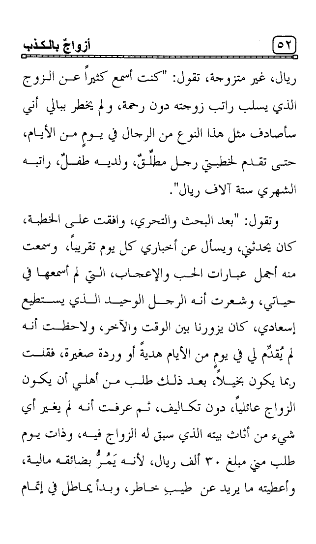 وتقول: "بعد البحث والتحري، وافقت على الخطبة، كان يحدثني، ويسأل عن أخباري كل يوم تقريباً، وسمعت منه أجمل عبارات الحب والإعجاب، التي لم أسمعها في حياتي، وشعرت أنه الرجل الوحيد الذي يستطيع إسعادي، كان يزورنا بين الوقت والآخر، ولاحظت أنه لم يُقدِّم لي في يومٍ من الأيام هديةً أو وردة صغيرة، فقلت ربما يكون بخيلاً، بعد ذلك طلب من أهلي أن يكون الزواج عائلياً، دون تكاليف، ثم عرفت أنه لم يغير أي شيء من أثاث بيته الذي سبق له الزواج فيه، وذات يوم طلب مني مبلغ 30 ألف ريال، لأنه يَمُرُّ بضائقه مالية، وأعطيته ما يريد عن طيبِ خاطر، وبدأ يماطل في إتمام