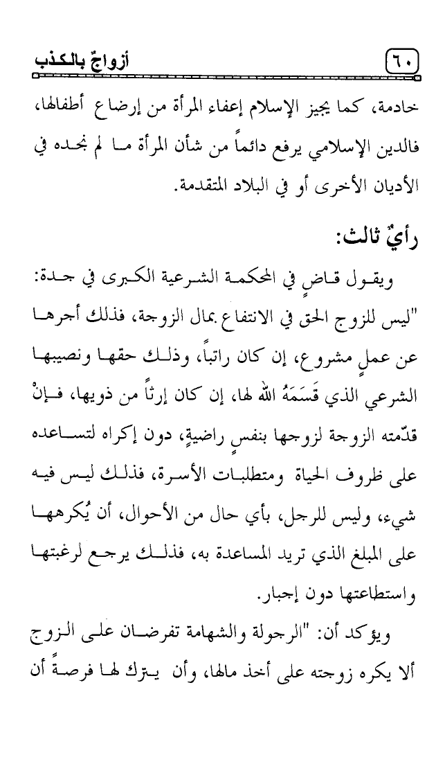ويؤكد أن: "الرجولة والشهامة تفرضان على الزوج ألا يكره زوجته على أخذ مالها، وأن يترك لها فرصةً أن
