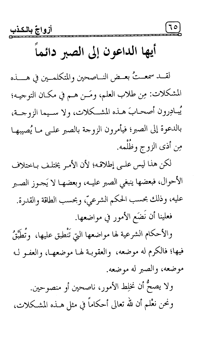 لقد سمعتُ بعض الناصحين والمتكلمين في هذه المشكلات: مِن طلاب العلم، ومَن هم في مكان التوجيه؛ يُبادِرون أصحابَ هذه المشكلات، ولا سيما الزوجة، بالدعوة إلى الصبر؛ فيأمرون الزوجة بالصبر على ما يُصيبها مِن أذى الزوج وظُلْمه.