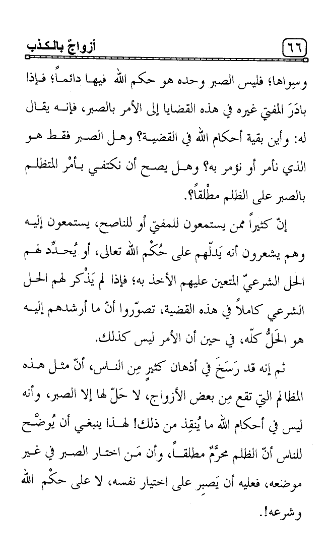 وسِواها؛ فليس الصبر وحده هو حكم الله فيها دائماً؛ فإذا بادَرَ المفتي غيره في هذه القضايا إلى الأمر بالصبر، فإنه يقال له: وأين بقية أحكام الله في القضية؟ وهل الصبر فقط هو الذي نأمر أو نؤمر به؟ وهل يصح أن نكتفي بأمْر المتظلم بالصبر على الظلم مطْلقاً؟.