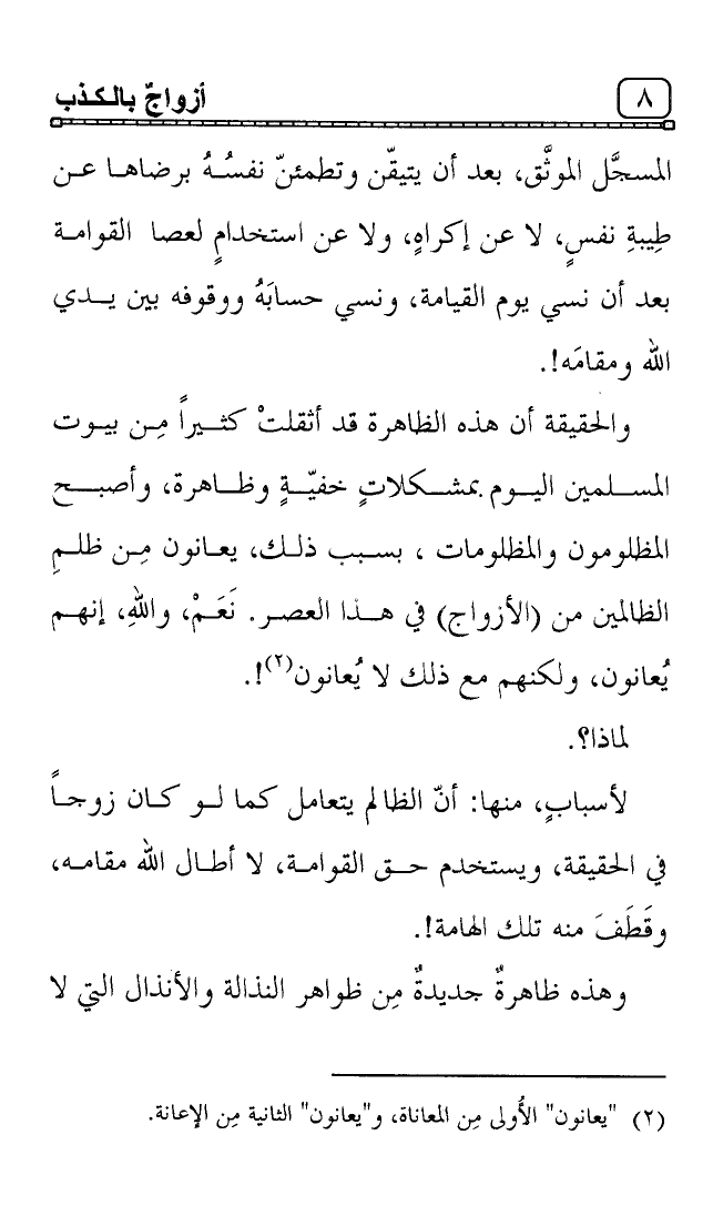 والحقيقة أن هذه الظاهرة قد أثقلتْ كثيراً مِن بيوت المسلمين اليوم بمشكلاتٍ خفيّةٍ وظاهرة، وأصبح المظلومون والمظلومات، بسبب ذلك، يعانون مِن ظلمِ الظالمين من الأزواج في هذا العصر. نَعَمْ، واللهِ، إنهم يُعانون، ولكنهم مع ذلك لا يُعانون1!.