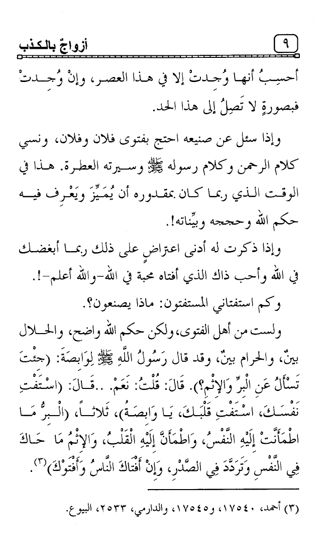 ولست من أهل الفتوى، ولكن حكم الله واضح، والحلال بينٌ، والحرام بينٌ، وقد قال رَسُولُ اللَّهِ صلى الله عليه وسلم لِوَابِصَةَ: "جِئْتَ تَسْأَلُ عَنِ الْبِرِّ وَالإِثْمِ؟ ". قَالَ: قُلْتُ: نَعَمْ. ..قَالَ: "اسْتَفْتِ نَفْسَكَ، اسْتَفْتِ قَلْبَكَ، يَا وَابِصَةُ، ثَلاثاً، الْبِرُّ مَا اطْمَأَنَّتْ إِلَيْهِ النَّفْسُ، وَاطْمَأَنَّ إِلَيْهِ الْقَلْبُ، وَالإِثْمُ مَا حَاكَ فِي النَّفْسِ وَتَرَدَّدَ فِي الصَّدْرِ، وَإِنْ أَفْتَاكَ النَّاسُ وَأَفْتَوْكَ" 1.