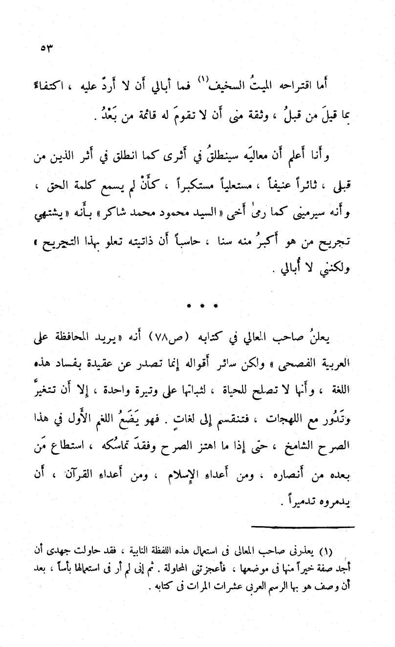 يعلنُ صاحب المعالي في كتابه (ص 78) أنه "يريد المحافظة على للعربية الفصحى" ولكن سائر أقواله إِنما تصدر عن عقيدة بفساد هذه اللغة، وأَنها لا تصلح للحياة، لثباتها على وتيرة واحدة، إلا أَن تتغير وتَدُور مع اللهجات، فتنقسم إِلى لغاتٍ. فهو يَضَعُ اللغم الأول في هذا الصرح الشامخ، حتى إذا ما اهتز الصرح وفقدَ تماسُكه، استطاع مَن بعده من أَنصاره, ومن أَعداء الإسلام، ومن أَعداءَ القرآن، أَن يدمروه تدميرا.