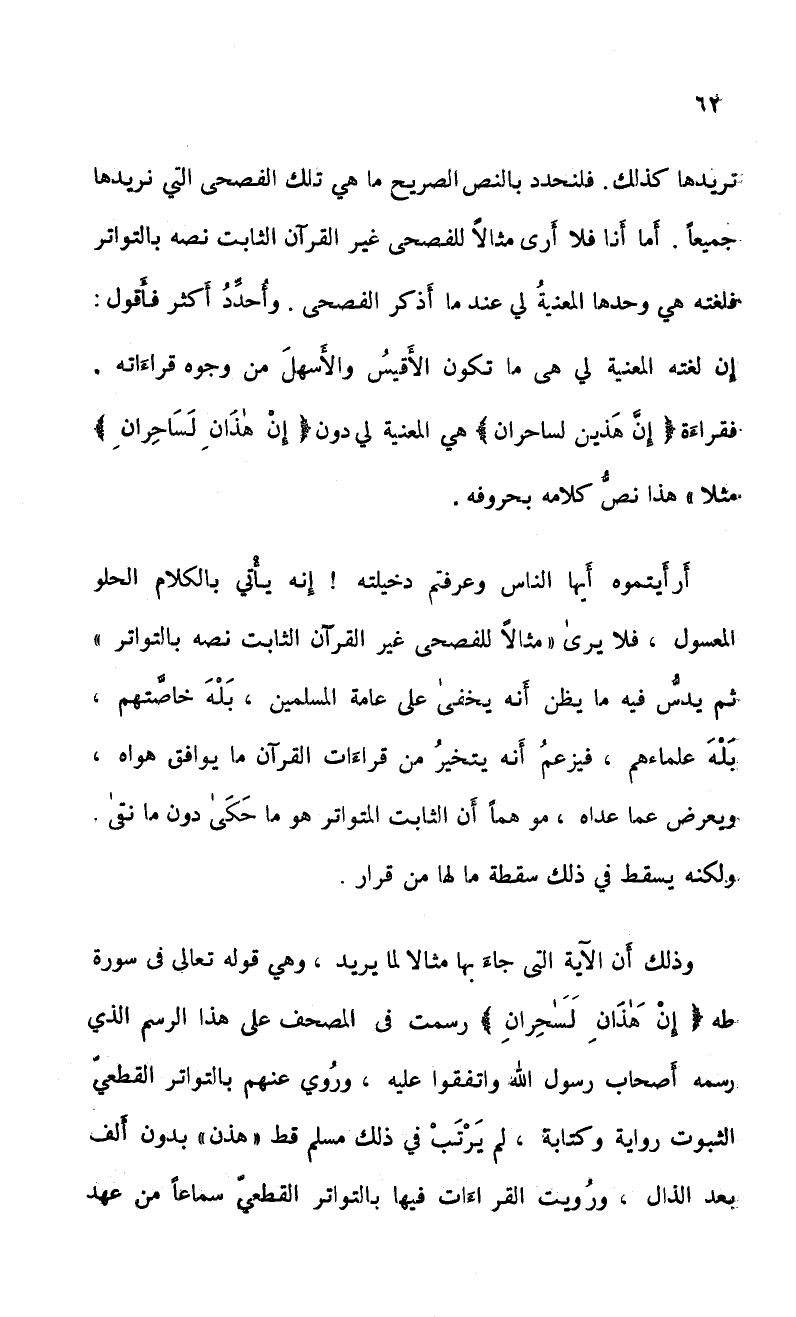 وذلك أن الآية التي جاء بها مثالا لما يريد، وهي قوله تعالى فى سورة طه (إنْ هَذَانِ لَسَحِرانِ) رسمت فى المصحف على هذا الرسم الذي رسمه أصحاب رسول الله واتفقوا عليه، ورُوي عنهم بالتواتر القطعي الثبوت رواية وكتابة، لم يَرْتَبْ في ذلك مسلم قط "هذن" بدون ألف بعد الذال، ورُويت القراءات فيها بالتواتر القطعي سماعاً من عهد