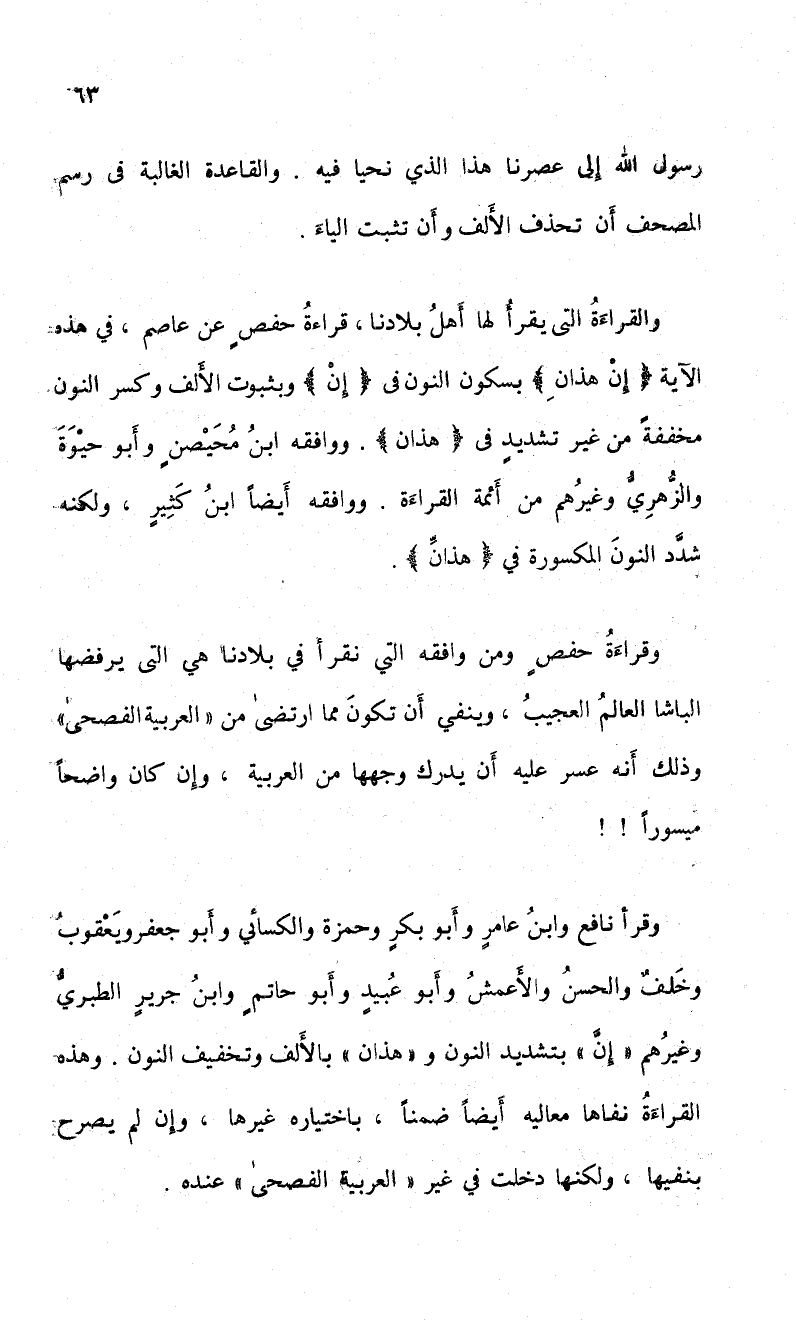 وقراءةُ حفص ومن وافقه التي نقرأ في بلادنا هي التي يرفضها الباشا العالمُ العجيبُ، وينفي أَن يكونَ مما ارتضى من "العربية الفصحى" وذلك أنه عسر عليه أن يدرك وجهها من العربية، وإِن كان واضحا ميسورا!!