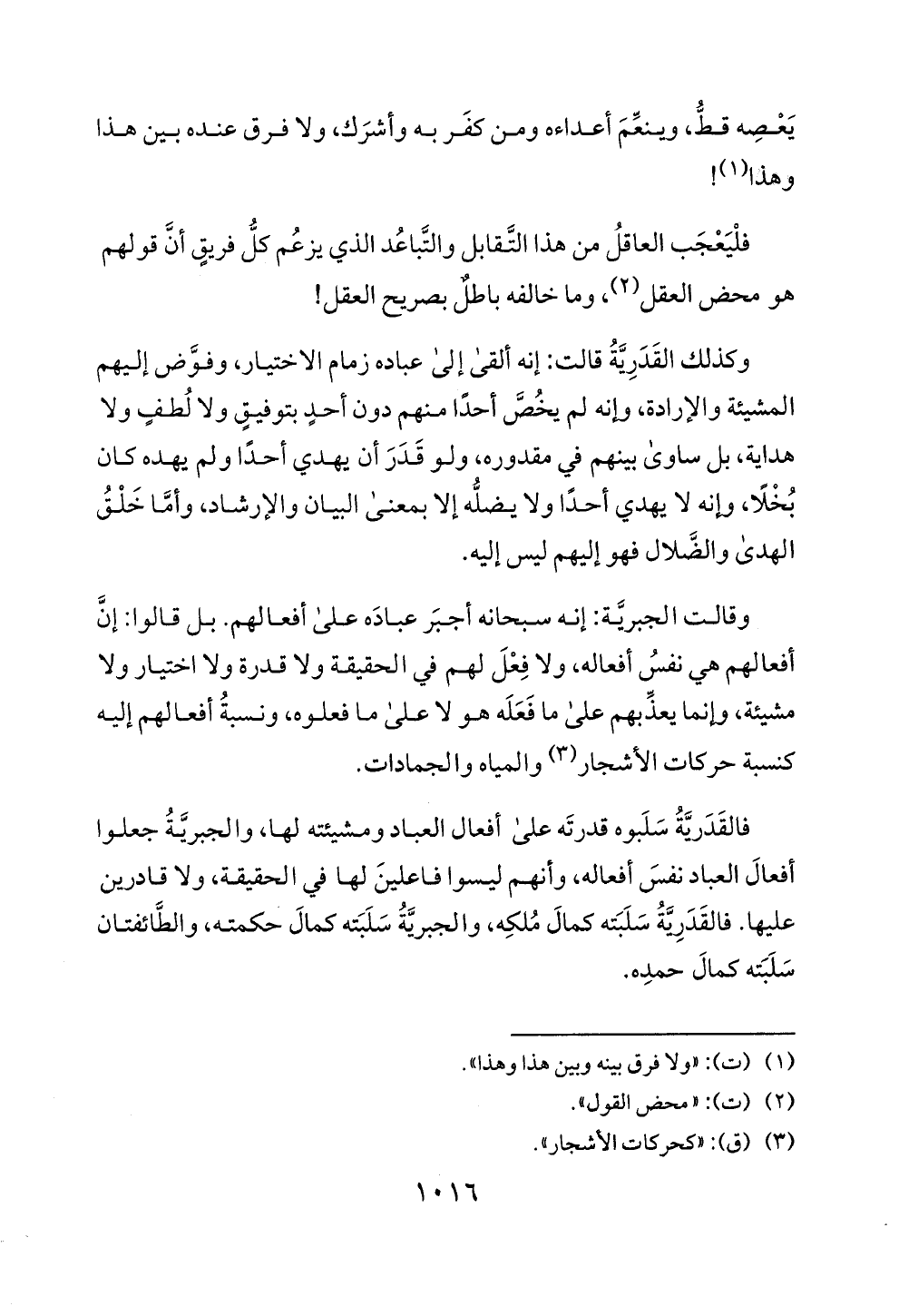 فالقدرية سلبوه قدرته على أفعال العباد ومشيئته لها، وا لجبرية جعلوا