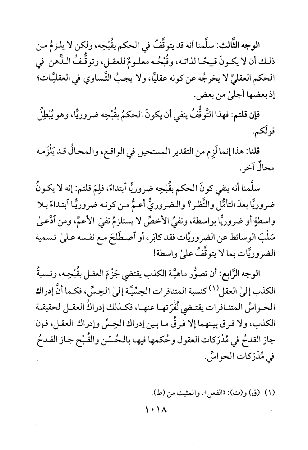 الوجه الرابع: ن تصور ماهية الكذب يقتضي جزم العقل بقبحه، ونسبة