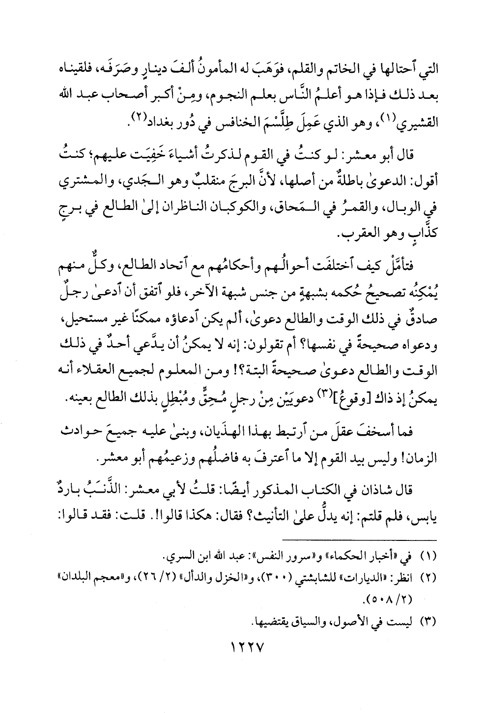 الزمان! وليس بيد القوم إلا ما عترف به فاضلهم وزعيمهم أبو معشر.