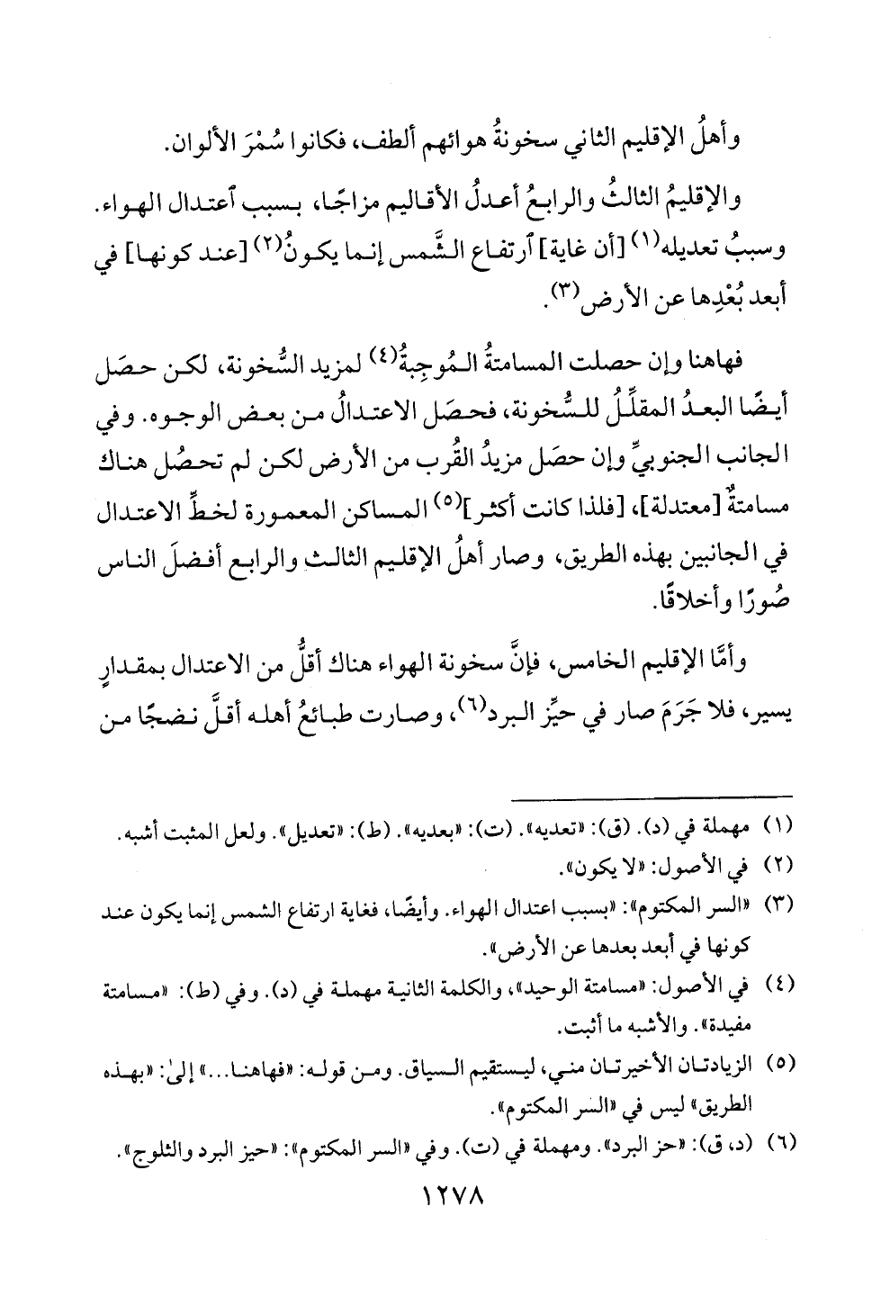 (3) "السر المكتوم ": "بسبب اعتدال الهو ء. وأيضا، فغاية ارتفاع الشمس إنما يكون عند