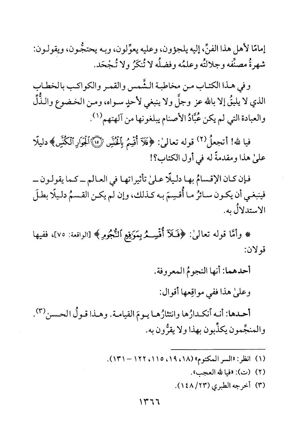 فيا دله! أتجعل (2) قوله تعالى: <فلا اق! م بالح! س! اتجوارالك! ى> دليلا