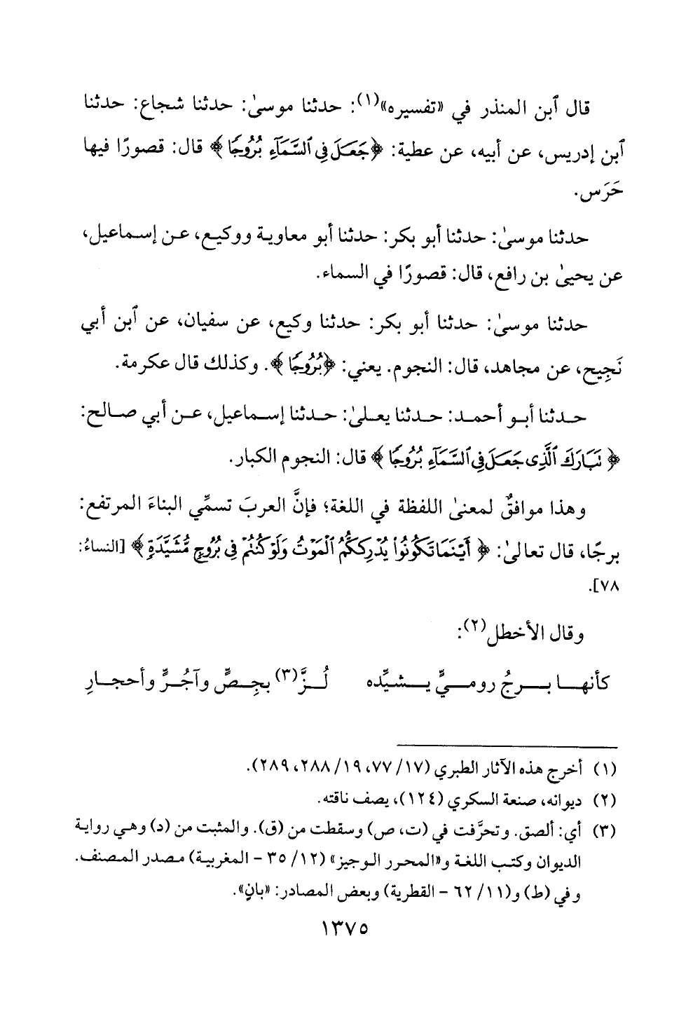 < تبارك الذى جعلفى الشما بروجا > قا ل: ا لنجوم ا لكبار.