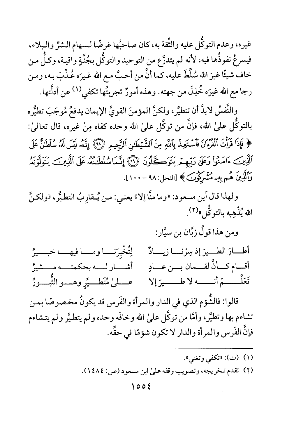 ولهذا قال ابن مسعود: "وما منا إلا" يعني: من يقارب التطير، "ولكن