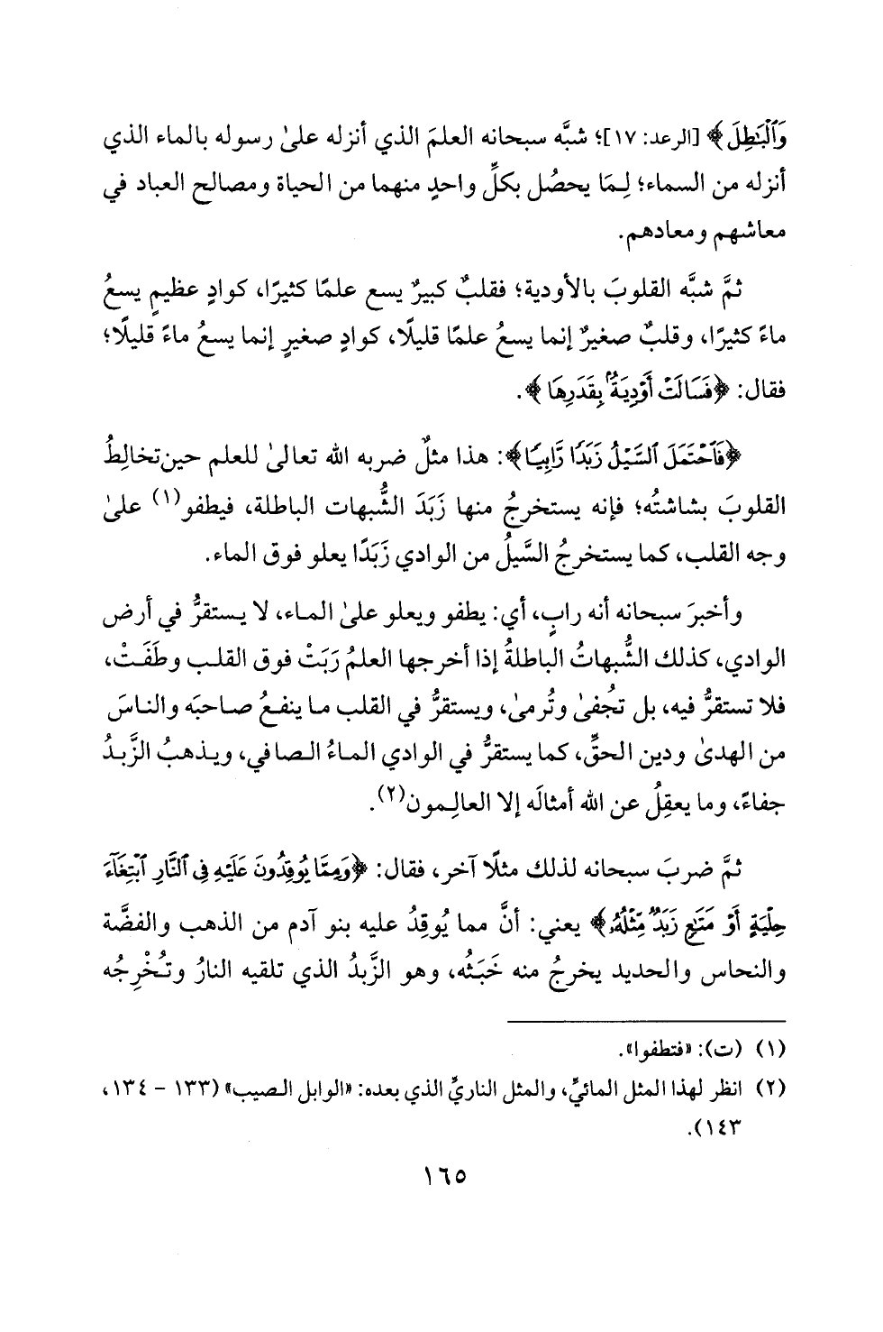 والنطل) [الرعد: 17]؛ شبه سبحانه العلم الذي أنزله على رسوله بالماء الذي