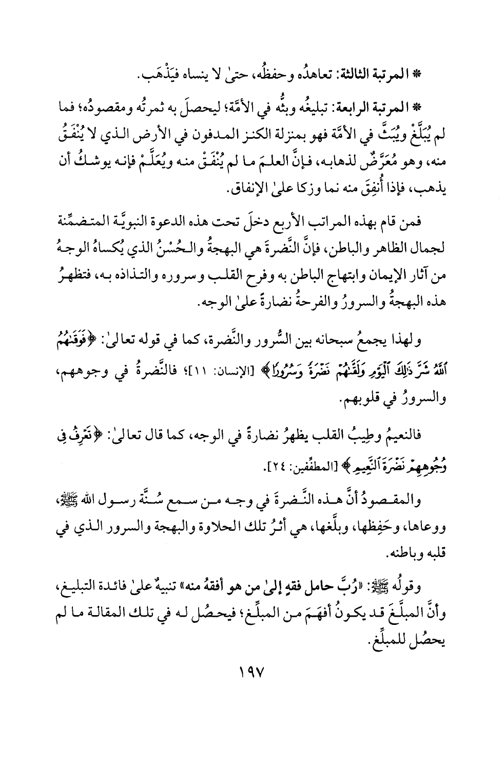 * ا لمرتبة الرابعة: تبليغه وبثه في الأمة؛ ليحصل به ثمرته ومقصوده؛ فما