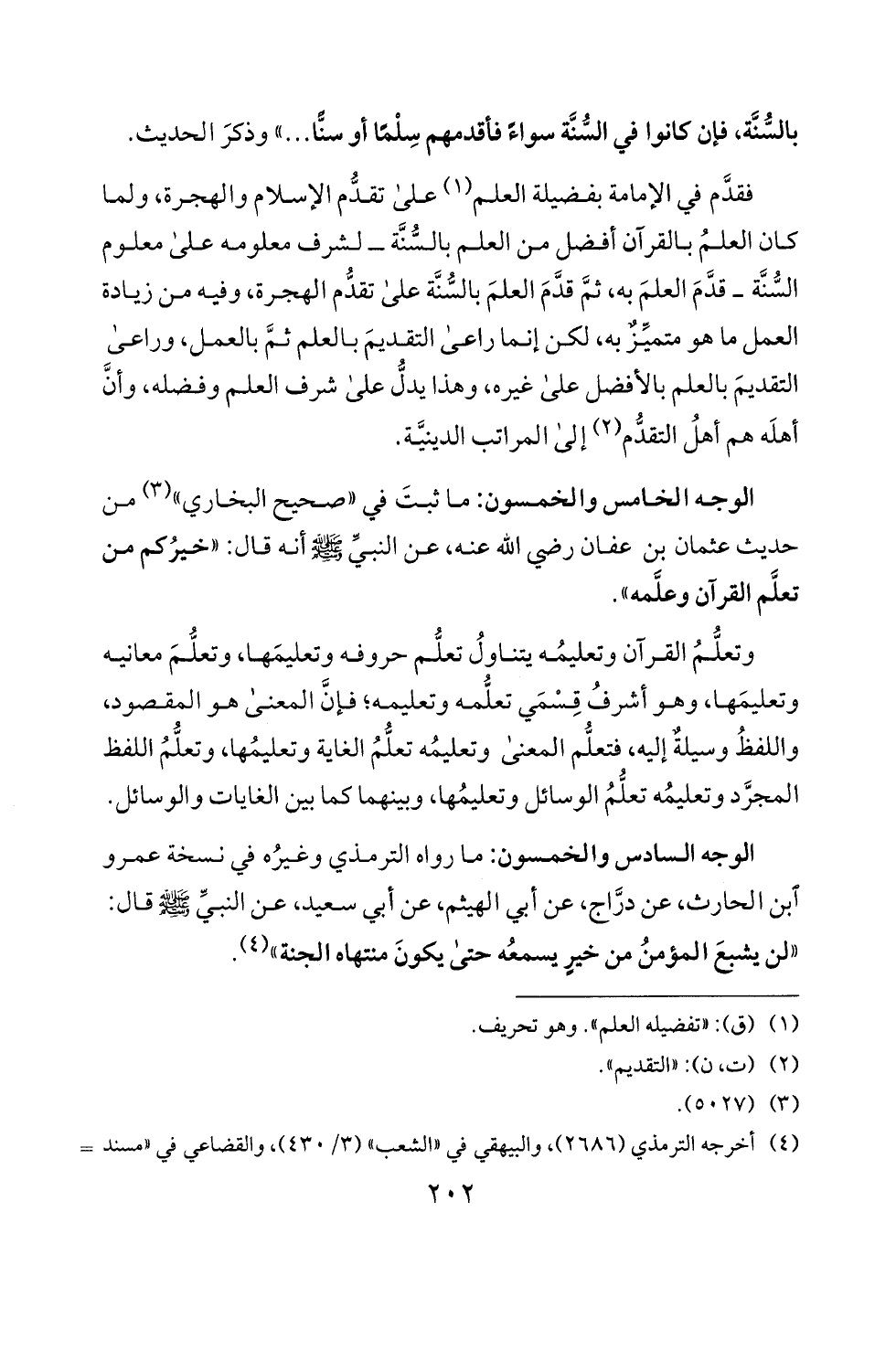 السنة - قدم العلم به، ثم قدم العلم بالسنة على تقدم الهجرة، وفيه من زيادة