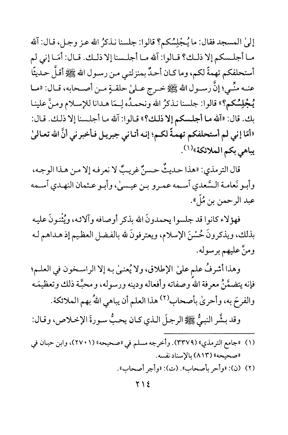 يجلسكم؟) " قالوا: جلسنا نذكر الله ونحمده لما هدانا للاسلام ومن علينا